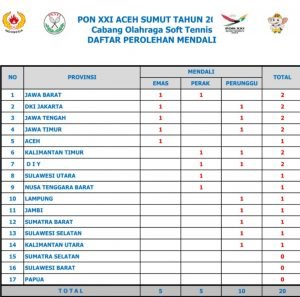 Klasemen Sementara Perolehan Medali Soft Tenis PON XXI 2024